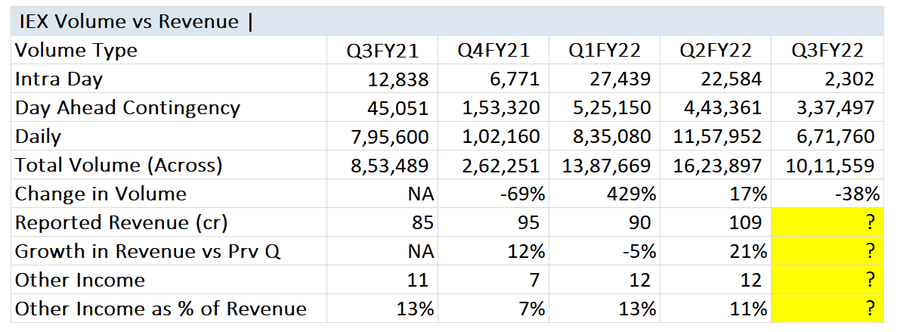 IEX Reports earnings coming Monday (24th Jan) during market hours IMV, the results should be around ~100cr Evident from the below table, volumes and revenue do not have a linear relationship.