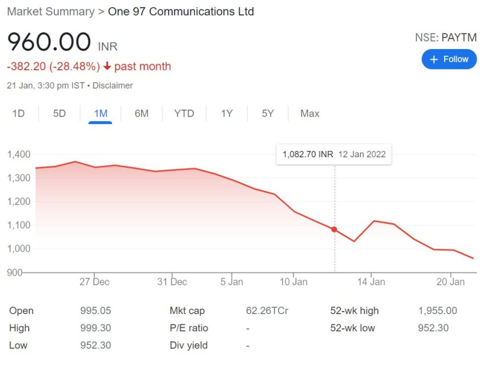 PayTM outperformed Netflix Jan 22 2022 On a MoM basis, PayTM outperformed Netflix by a staggering 8%, on a lighter note. Share this: Share on X (Opens in new window) X Share on Facebook (Opens in new window) Facebook Print (Opens in new window) Print Share on LinkedIn (Opens in new window) LinkedIn Share on Tumblr (Opens in new window) Tumblr Share on Telegram (Opens in new window) Telegram Share on WhatsApp (Opens in new window) WhatsApp Email a link to a friend (Opens in new window) Email Like Loading... Related Published by Asmeet Shah View all posts by Asmeet Shah