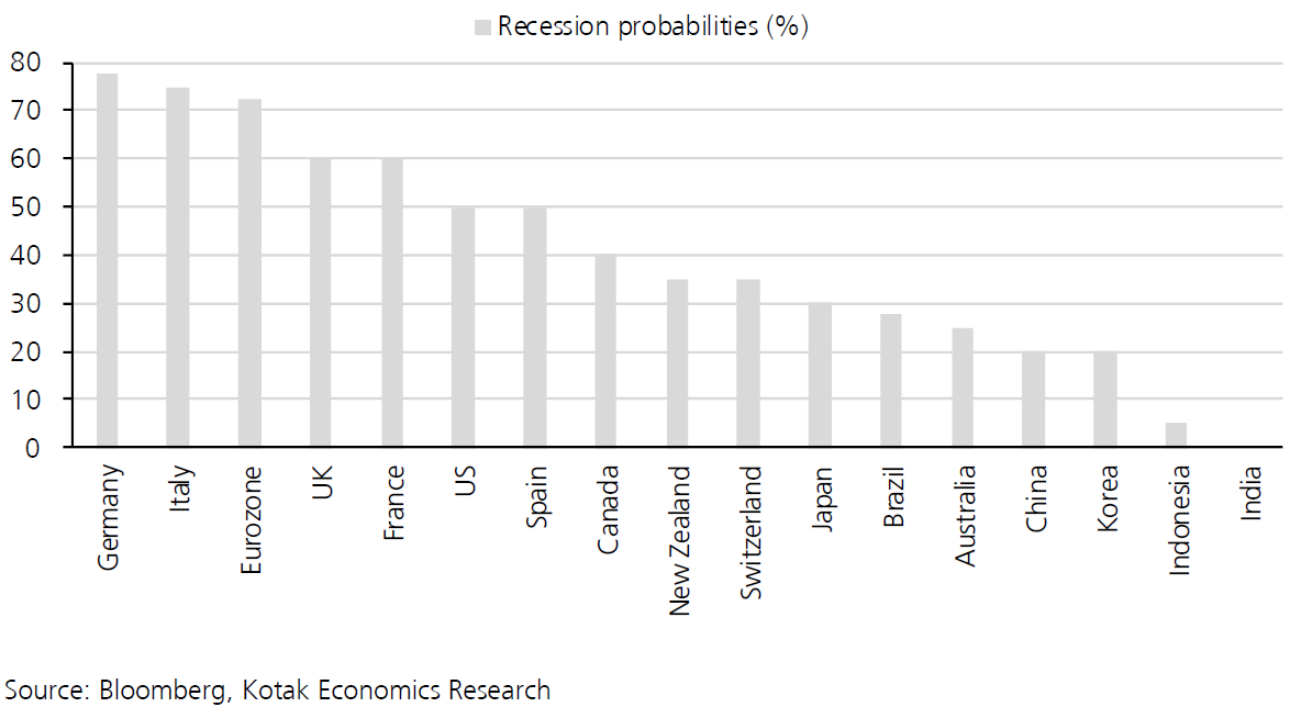 Probabilities of the recession Sep 24 202224 Sep 2022 The probabilities of a recession are the highest for developed economies. India’s recession probability is barely visible in the chart below Share this: Share on X (Opens in new window) X Share on Facebook (Opens in new window) Facebook Print (Opens in new window) Print Share on LinkedIn (Opens in new window) LinkedIn Share on Tumblr (Opens in new window) Tumblr Share on Telegram (Opens in new window) Telegram Share on WhatsApp (Opens in new window) WhatsApp Email a link to a friend (Opens in new window) Email Like Loading... Related Published by Asmeet Shah View all posts by Asmeet Shah