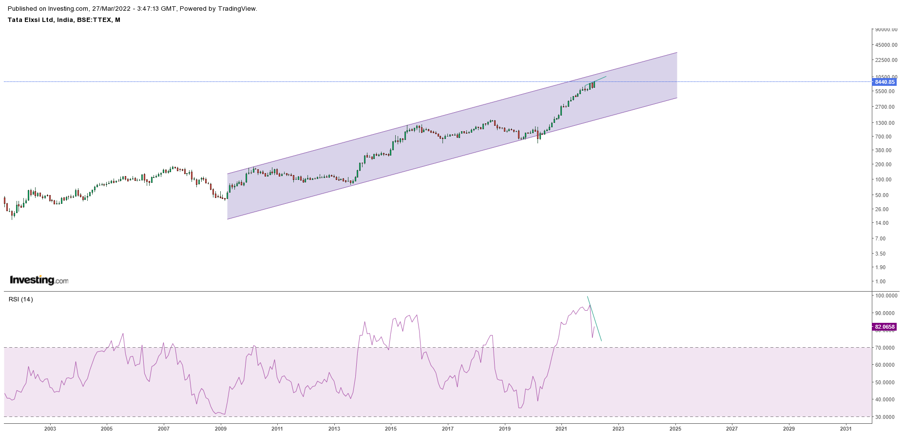 Tata Elxi Charts indicate sell… Oct 17 202217 Oct 2022 The compounding story might just end in the 11-12K range. Divergence has already started forming on monthly charts. This might just be a multi-year top. Do not miss the exit as an investor. CMP 8440 Share this: Share on X (Opens in new window) X Share on Facebook (Opens in new window) Facebook Print (Opens in new window) Print Share on LinkedIn (Opens in new window) LinkedIn Share on Tumblr (Opens in new window) Tumblr Share on Telegram (Opens in new window) Telegram Share on WhatsApp (Opens in new window) WhatsApp Email a link to a friend (Opens in new window) Email Like Loading... Related Published by Asmeet Shah View all posts by Asmeet Shah