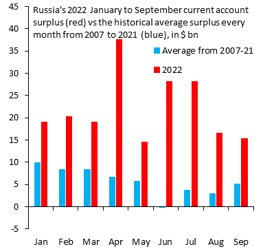 Russia’s current account surplus is $198 bn in 2022 vs $51 bn in prior years Oct 18 202218 Oct 2022 When the western countries imposed sanctions on Russia, they carved out energy, as they feared higher oil prices. Thus, Russia’s current account surplus is $198 bn in 2022 (red) vs $51 bn (blue) in prior years. Share this: Share on X (Opens in new window) X Share on Facebook (Opens in new window) Facebook Print (Opens in new window) Print Share on LinkedIn (Opens in new window) LinkedIn Share on Tumblr (Opens in new window) Tumblr Share on Telegram (Opens in new window) Telegram Share on WhatsApp (Opens in new window) WhatsApp Email a link to a friend (Opens in new window) Email Like Loading... Related Published by Asmeet Shah View all posts by Asmeet Shah