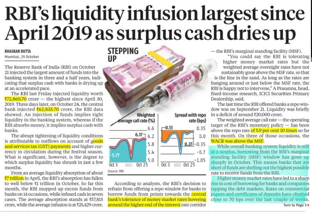 Banking liquidity in India has fallen rapidly in last few months and Banks are having to borrow from RBI at steep rates (see last para) as Deposit growth is weak.