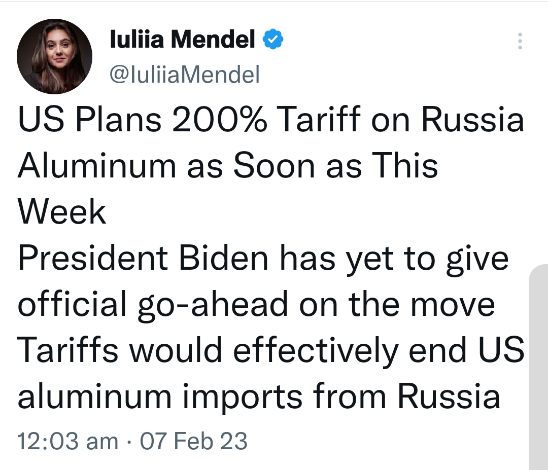 US Plans 200% Tariff on Russia Aluminum as Soon as This Week